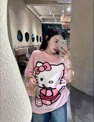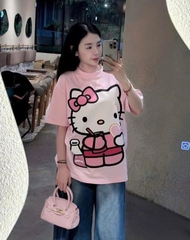 A266- Áo phông dáng rộng Hello kitty màu hồng in pet cao cấp