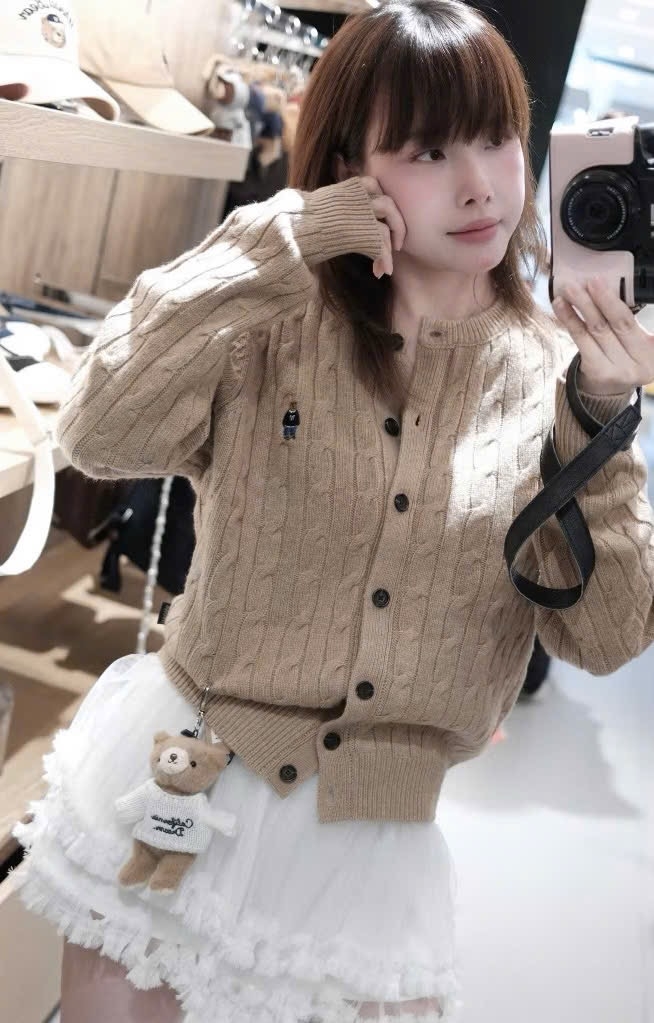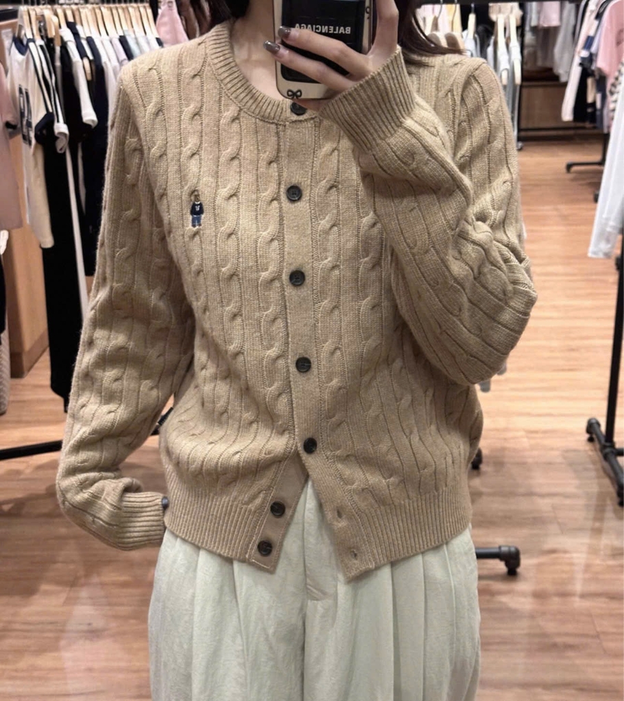 A351- Áo len cadigan vặn thừng thêu Gấu màu nâu