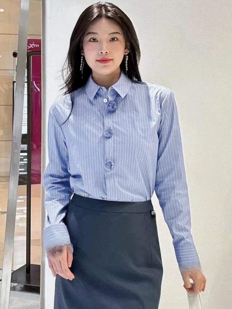 A402- Áo sơ mi kẻ xanh cổ bẻ đính hoa nổi