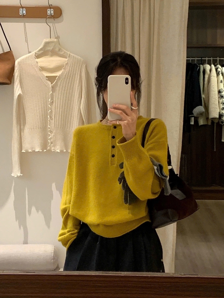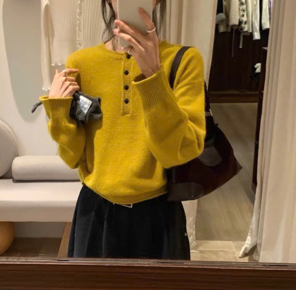 Đánh giá A431- Áo len dài tay cổ tròn khuy ngực vàng mù tat
