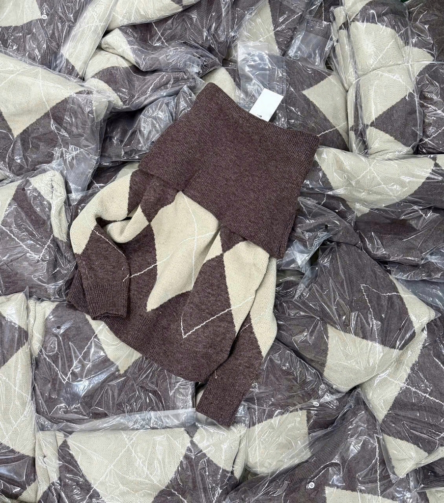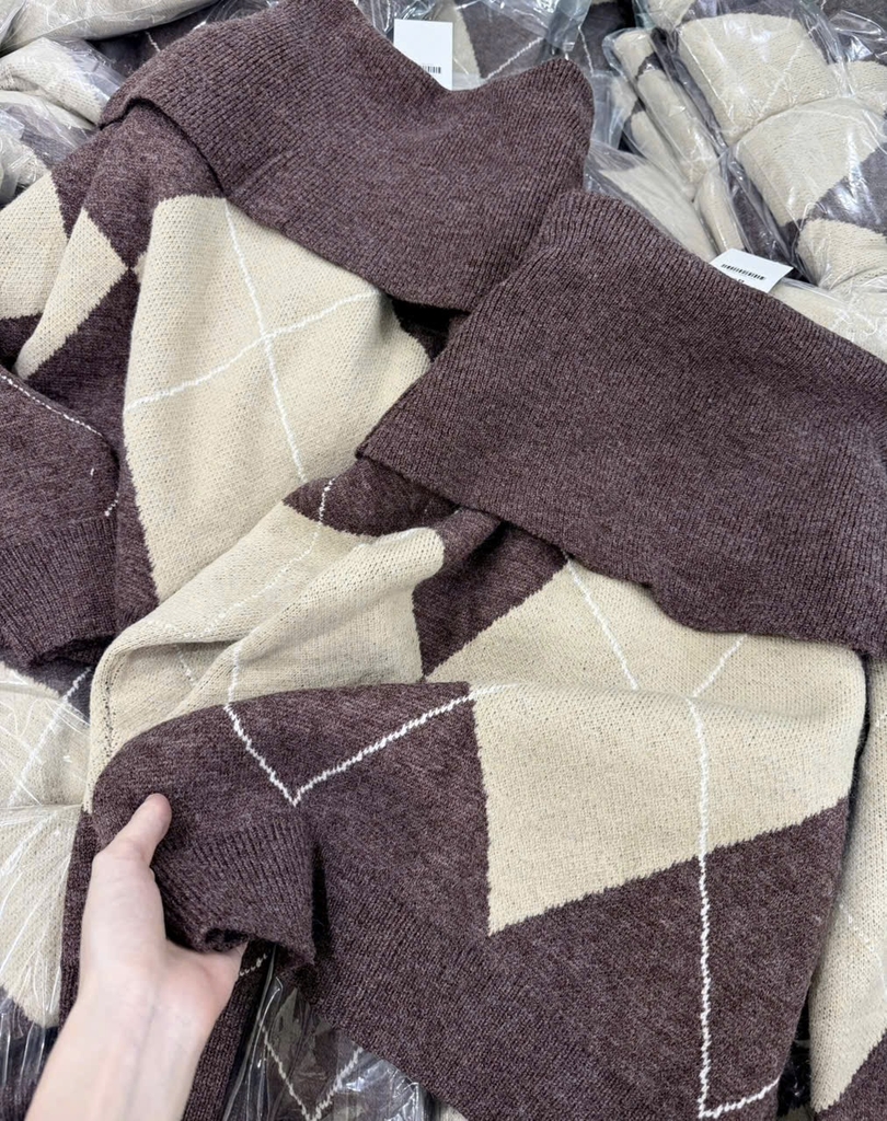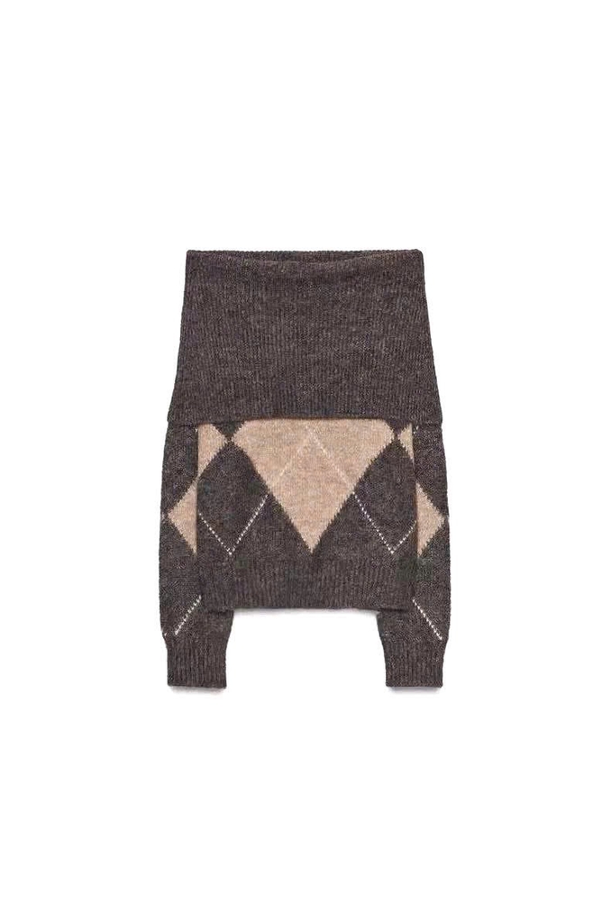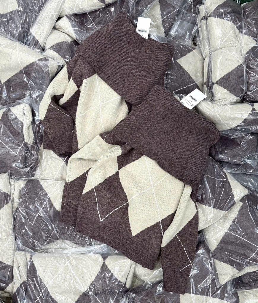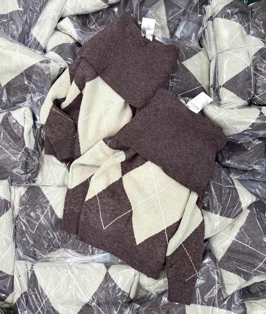 A433-Áo len dài tay trễ vai hoạ tiết quả trám nâu be