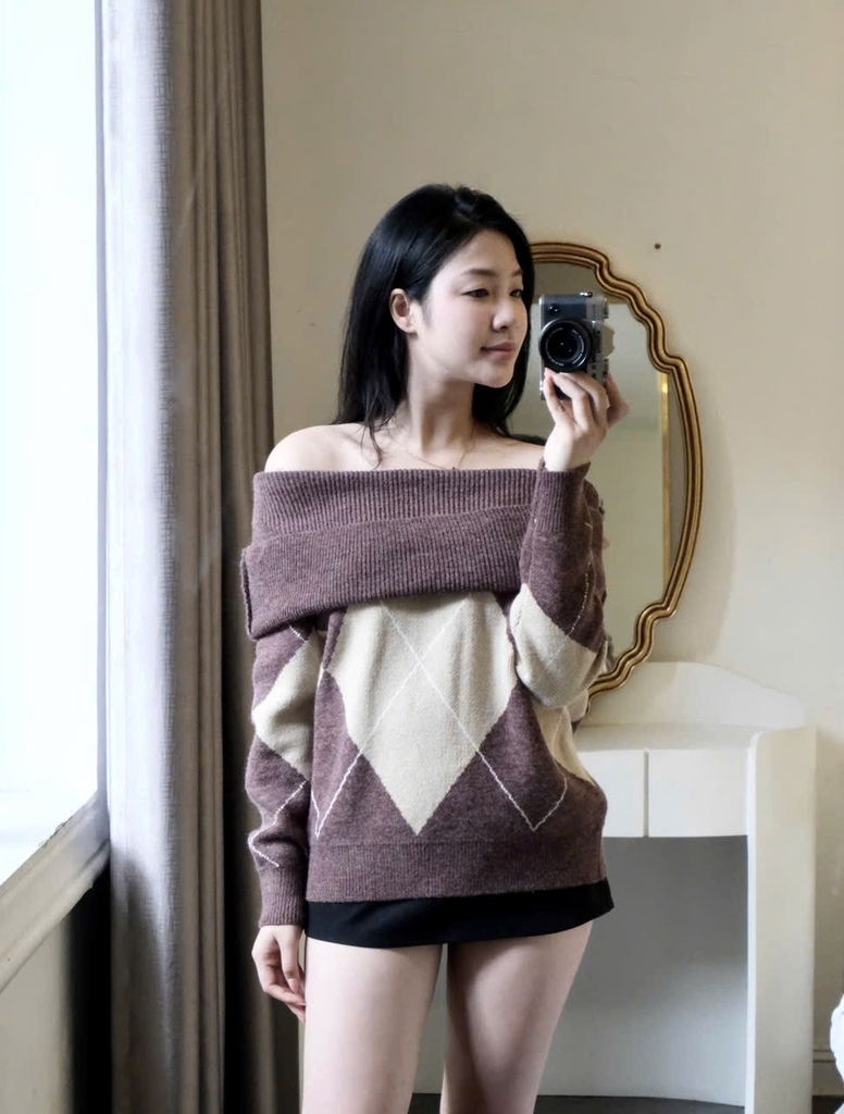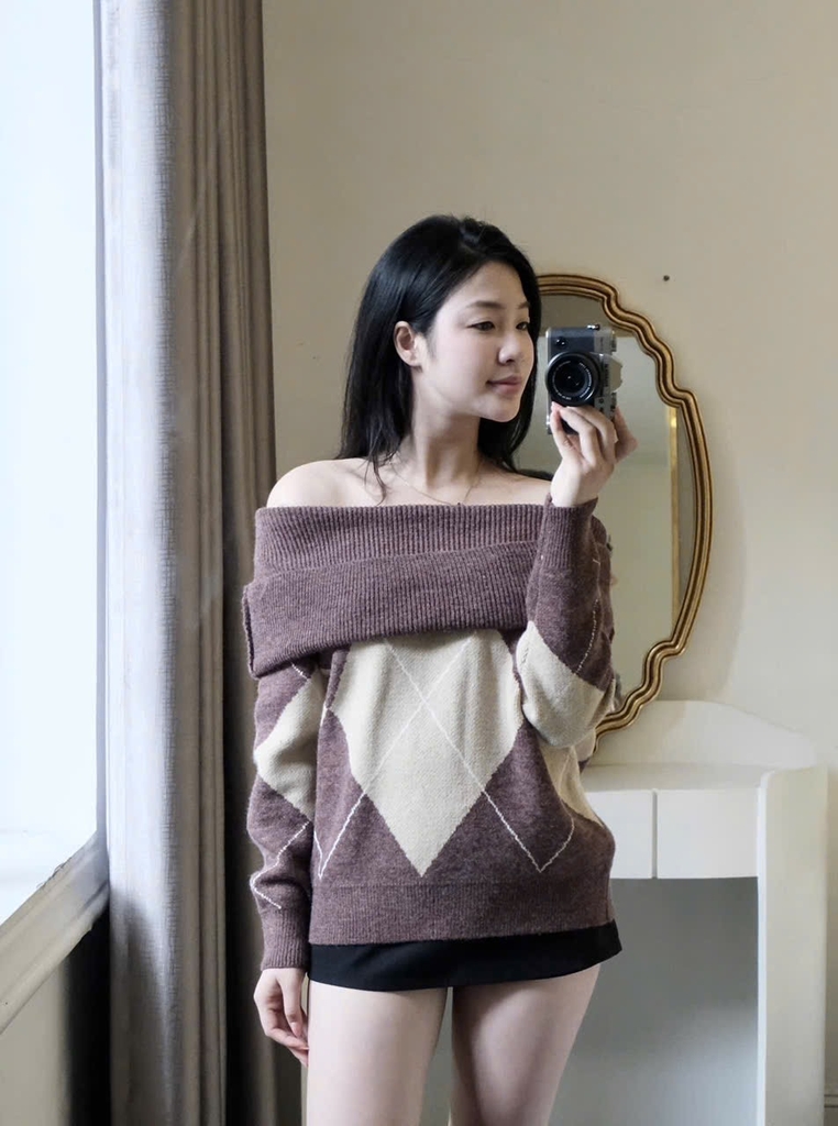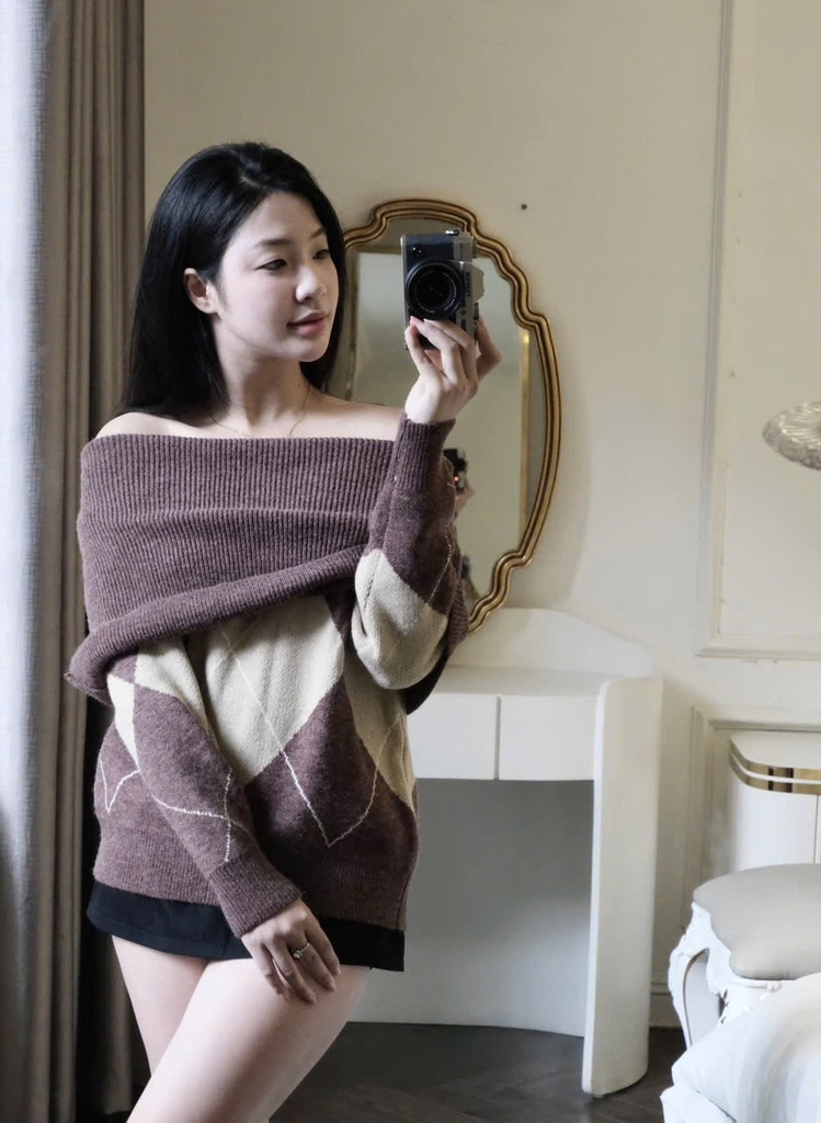 Đánh giá A433-Áo len dài tay trễ vai hoạ tiết quả trám nâu be