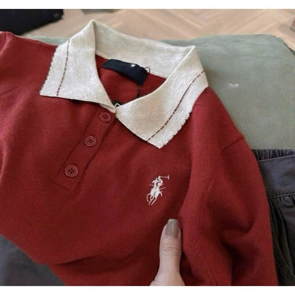 A434- Áo len đỏ thẻu viền be hàng Quảng Châu