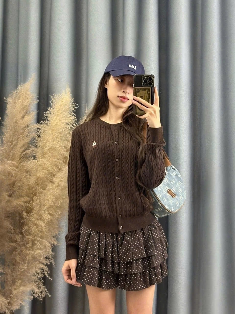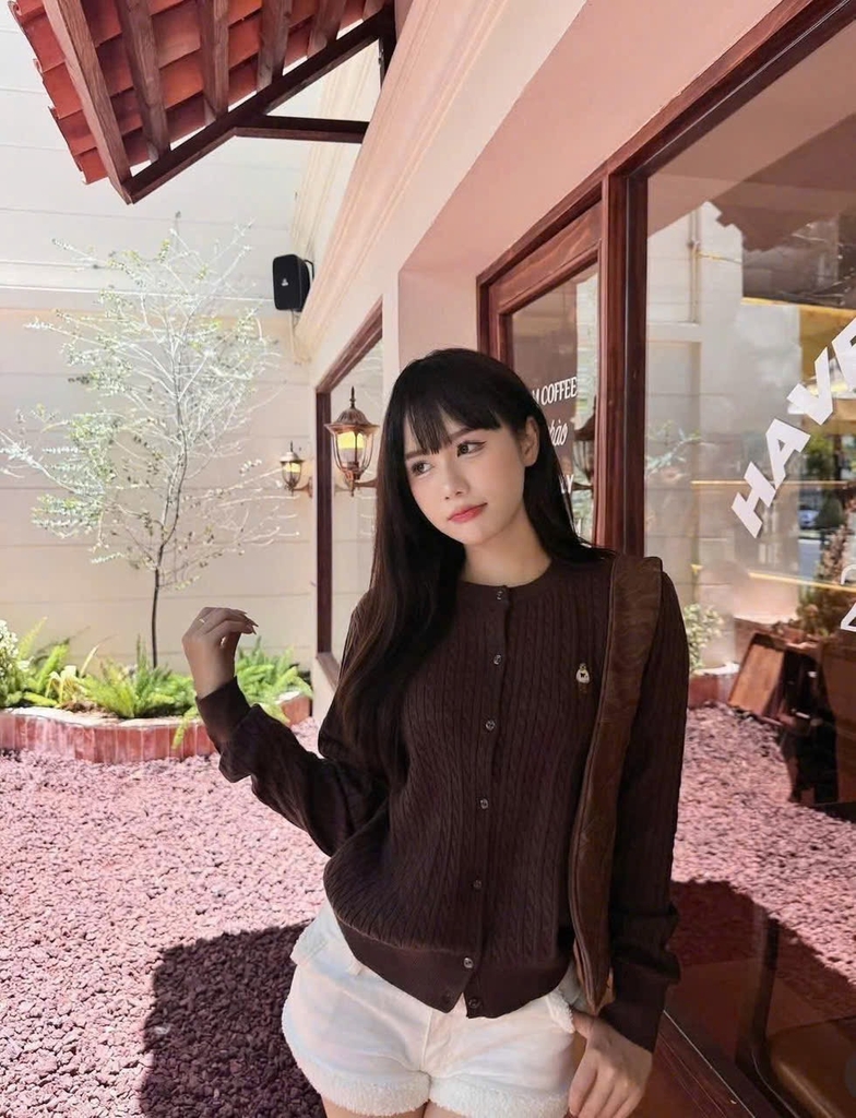 A442- Áo len cadigan màu nâu thêu gấu