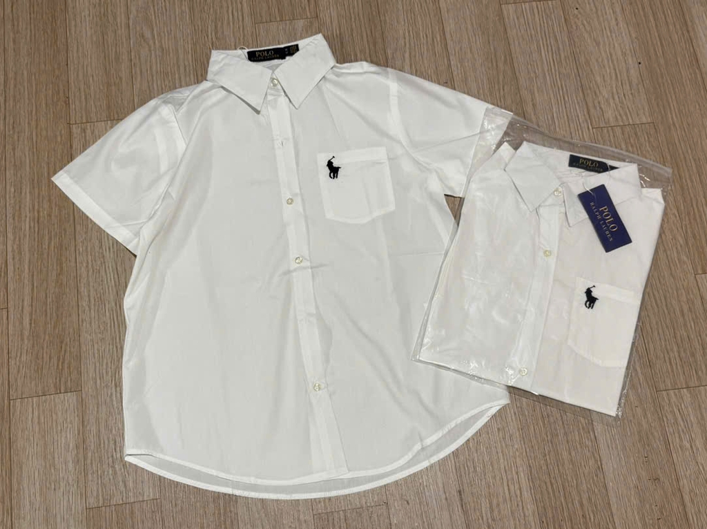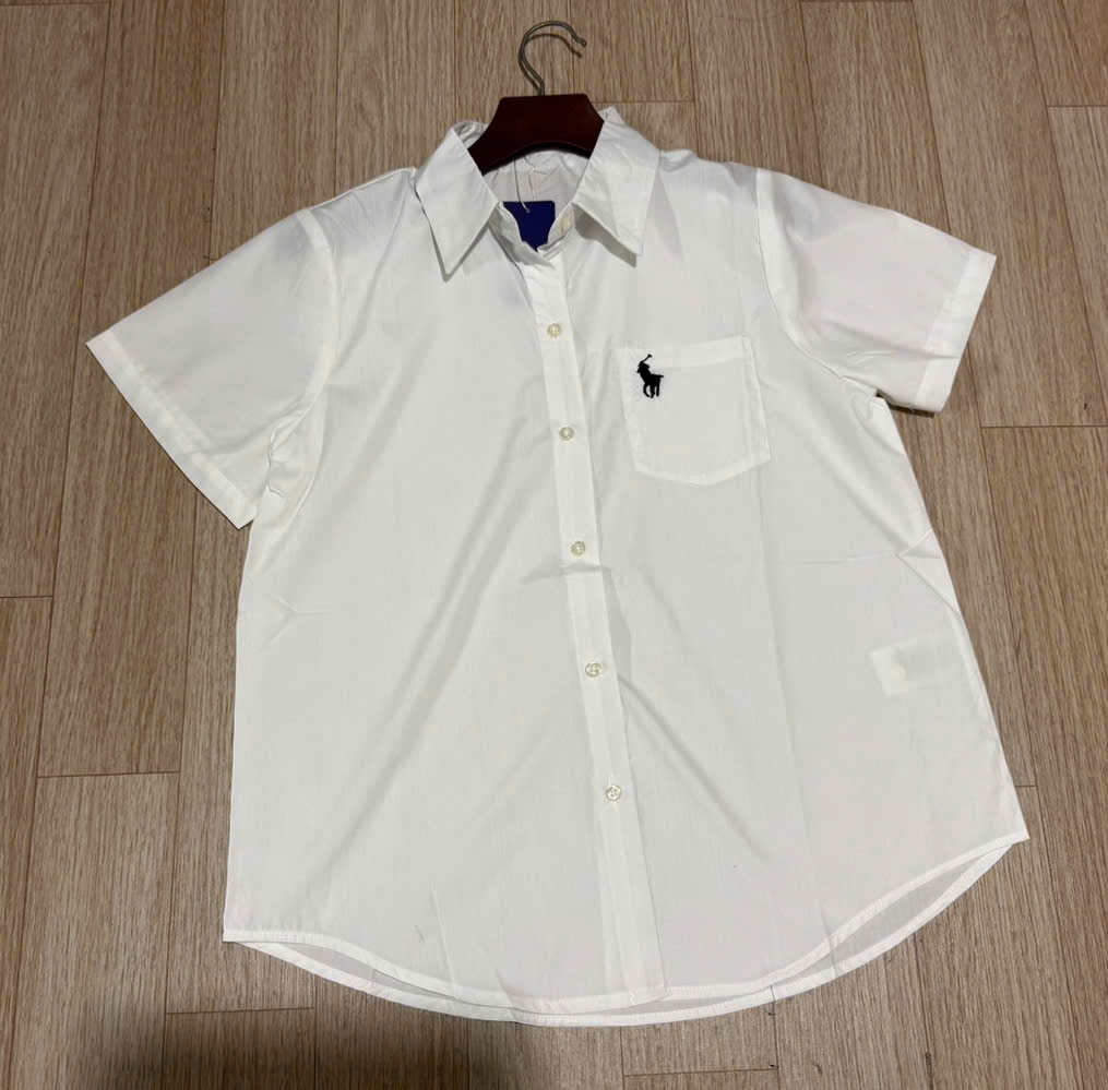 a465-Áo sơ mi trắng tay lật thêu cổ đức chất thô lụa hàng xuất
