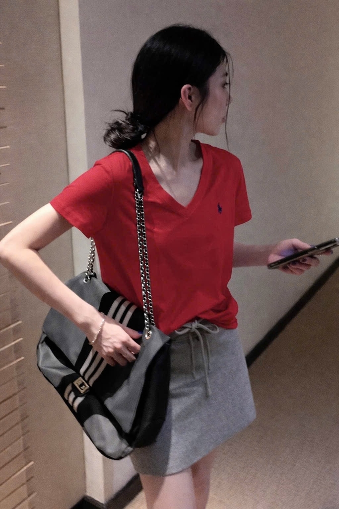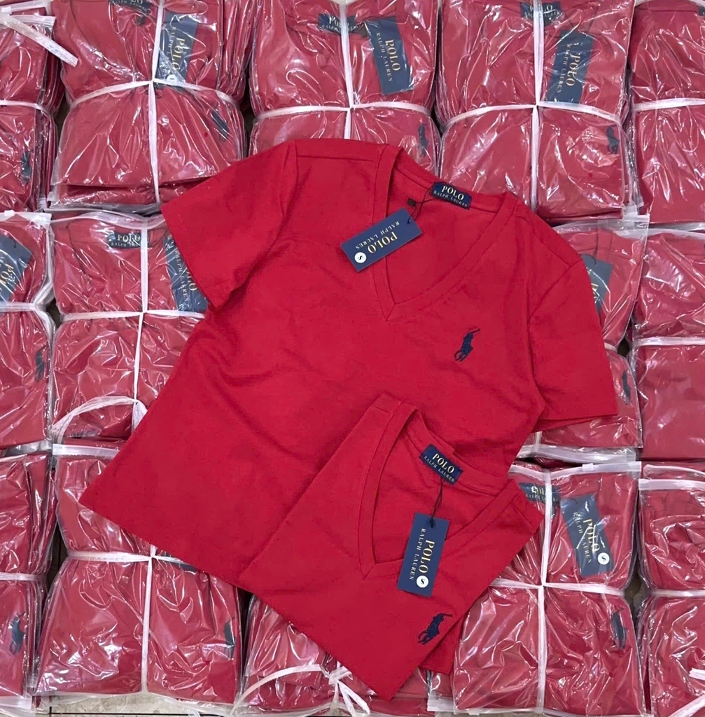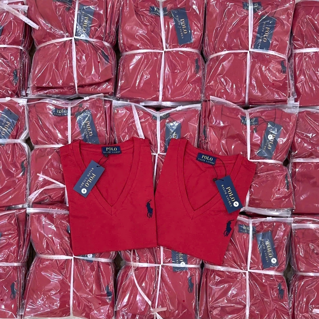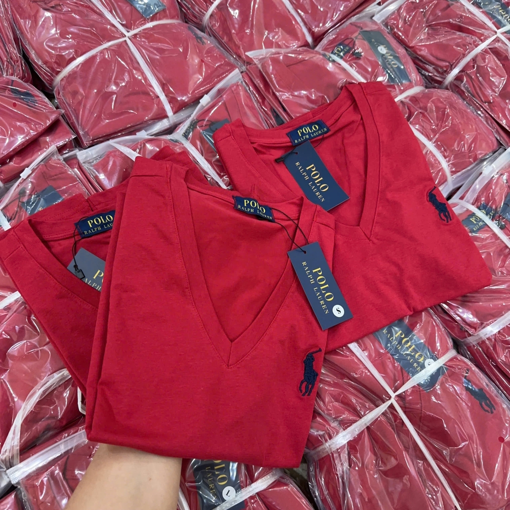 A513-Áo thun đỏ cộc tay cổ V thêu ngựa