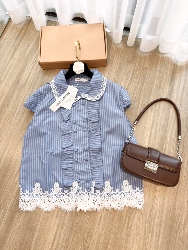 A582- Áo sơ mi kẻ chân ren cúc bọc chất thô mềm