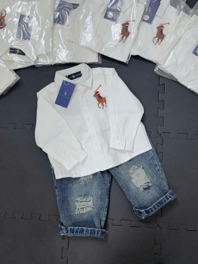 AOKID014-Áo sơ mi trắng RLP thêu logo dài tay trẻ em