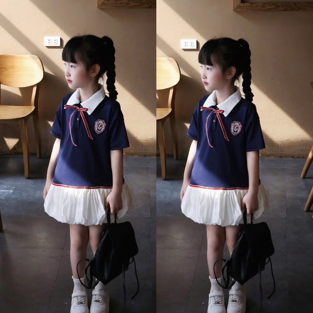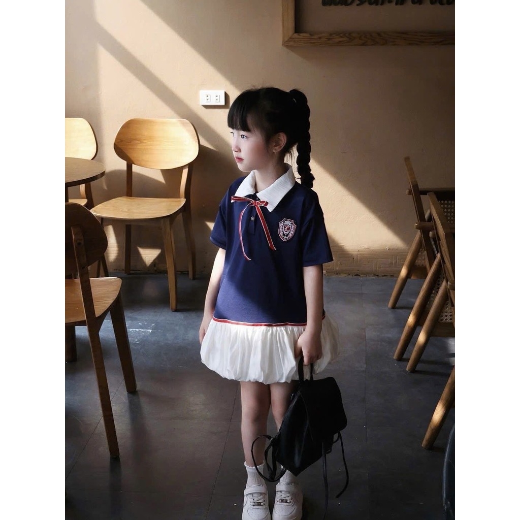 Bt577- đầm bé gái màu than huy hiệu đuôi trắng