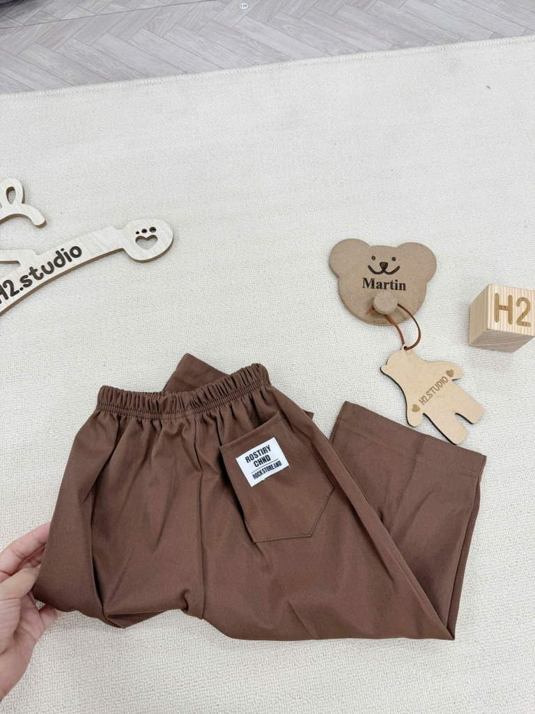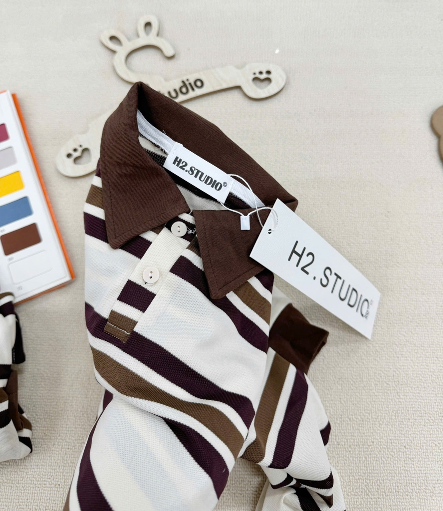 BT619- Bộ bé trai áo polo dài tay kẻ nâu phối quần kaki dài