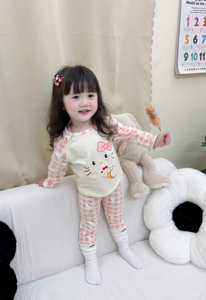 Bt685- Combo 3 bộ thun díp dài tay đỏ trắng bé gái KITTY trắng hồng