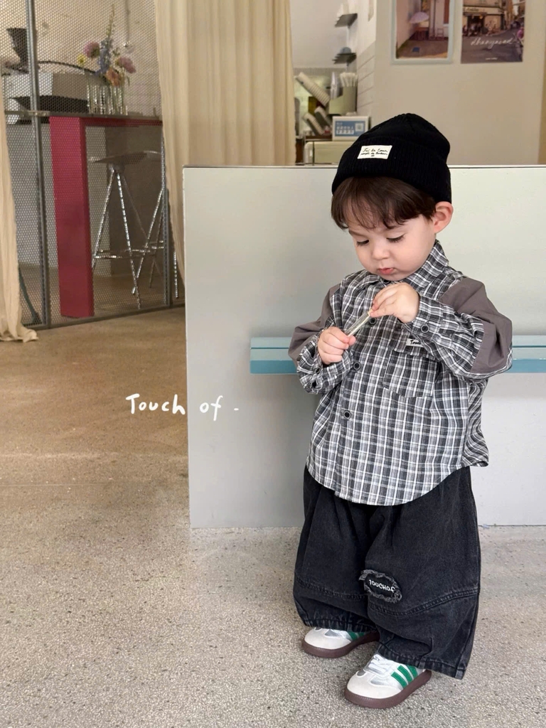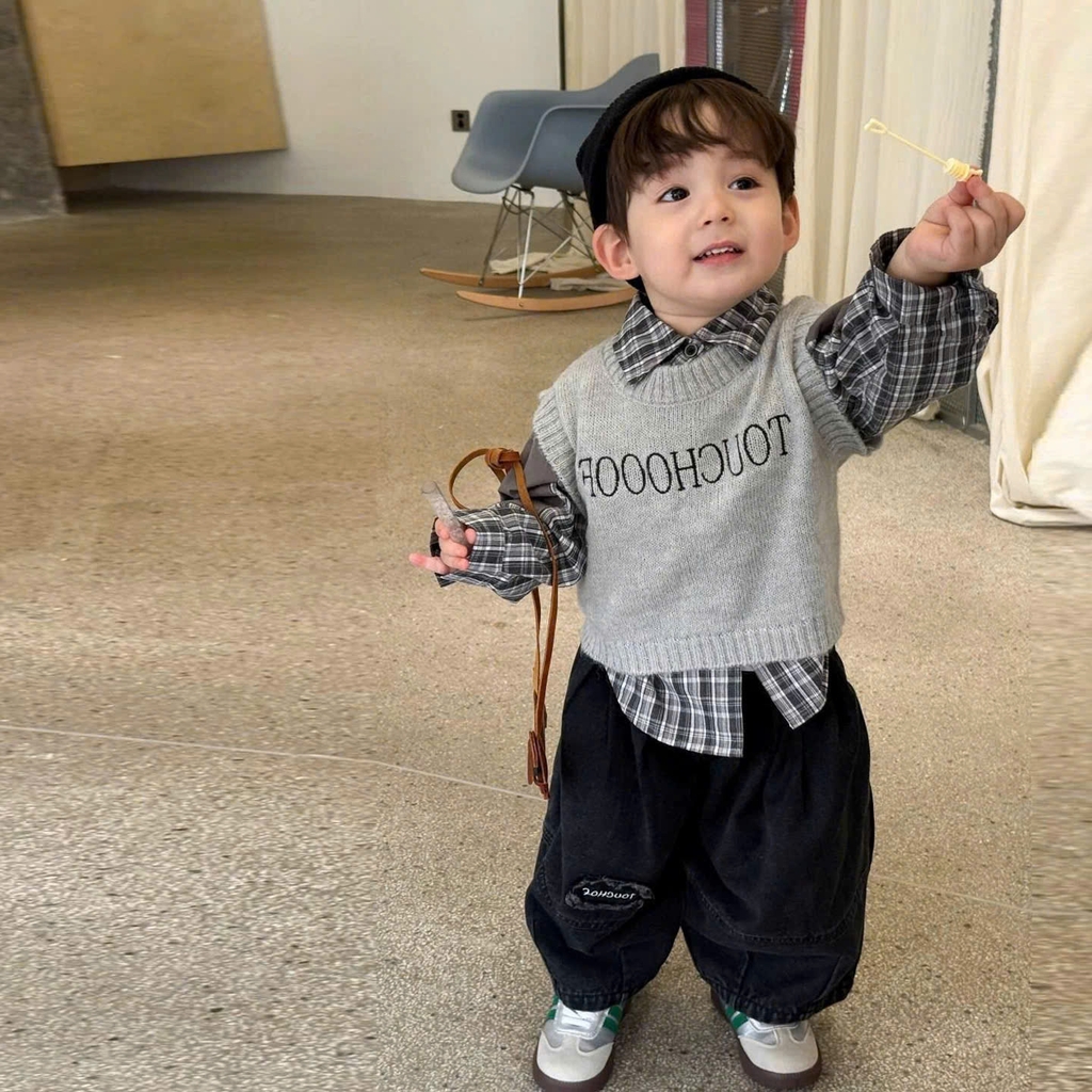 BT686- Bộ 3 chi tiết kẻ caro đen mix quần jeans đen kèm áo gile xám