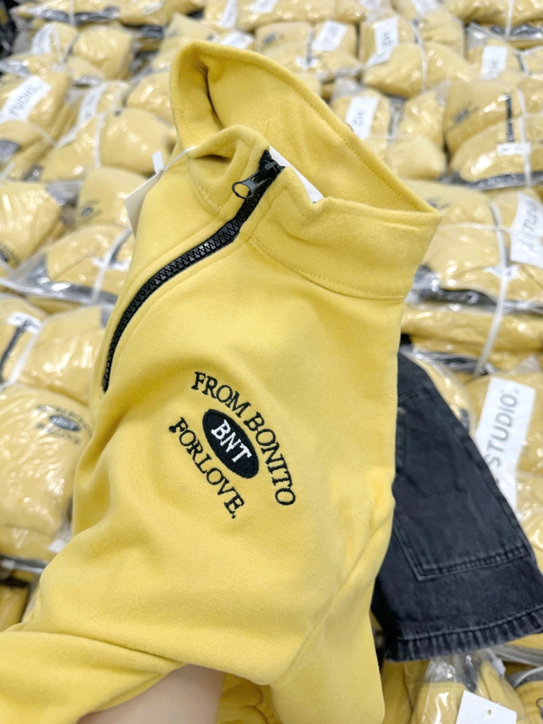 Bt701- bộ áo nỉ vàng cổ trụ mix quần jeans đen suông