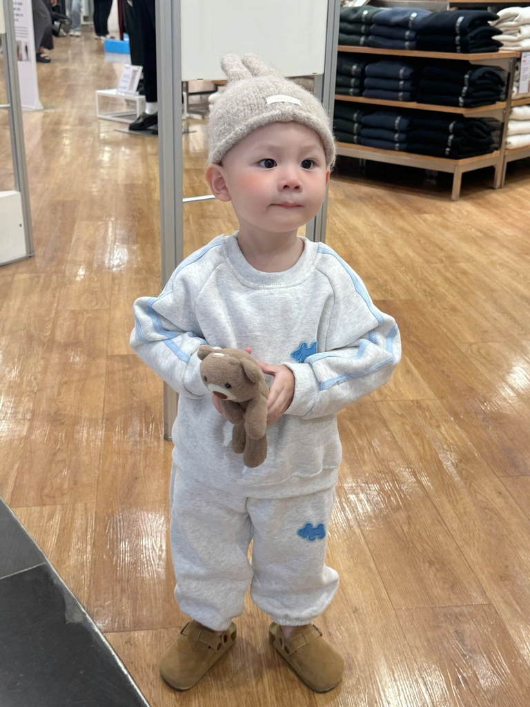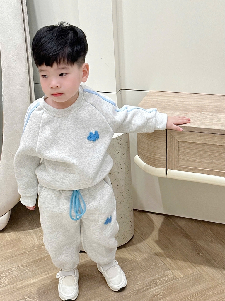 bt722- Bộ nỉ màu ghi viền xanh nhạt thêu cún
