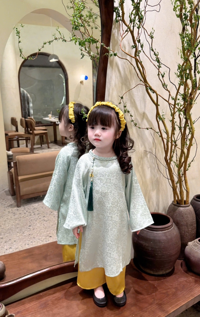 Đánh giá Bt750- Bộ áo dài bé gái cách tân cổ tròn xanh quần vàng tặng kèm bờm tóc