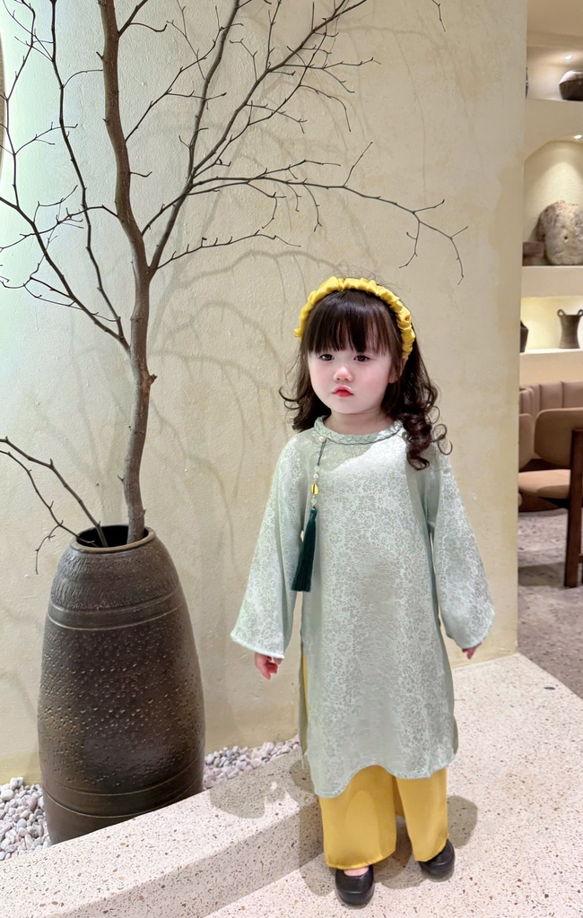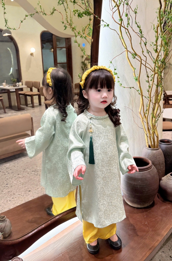 Bt750- Bộ áo dài bé gái cách tân cổ tròn xanh quần vàng tặng kèm bờm tóc