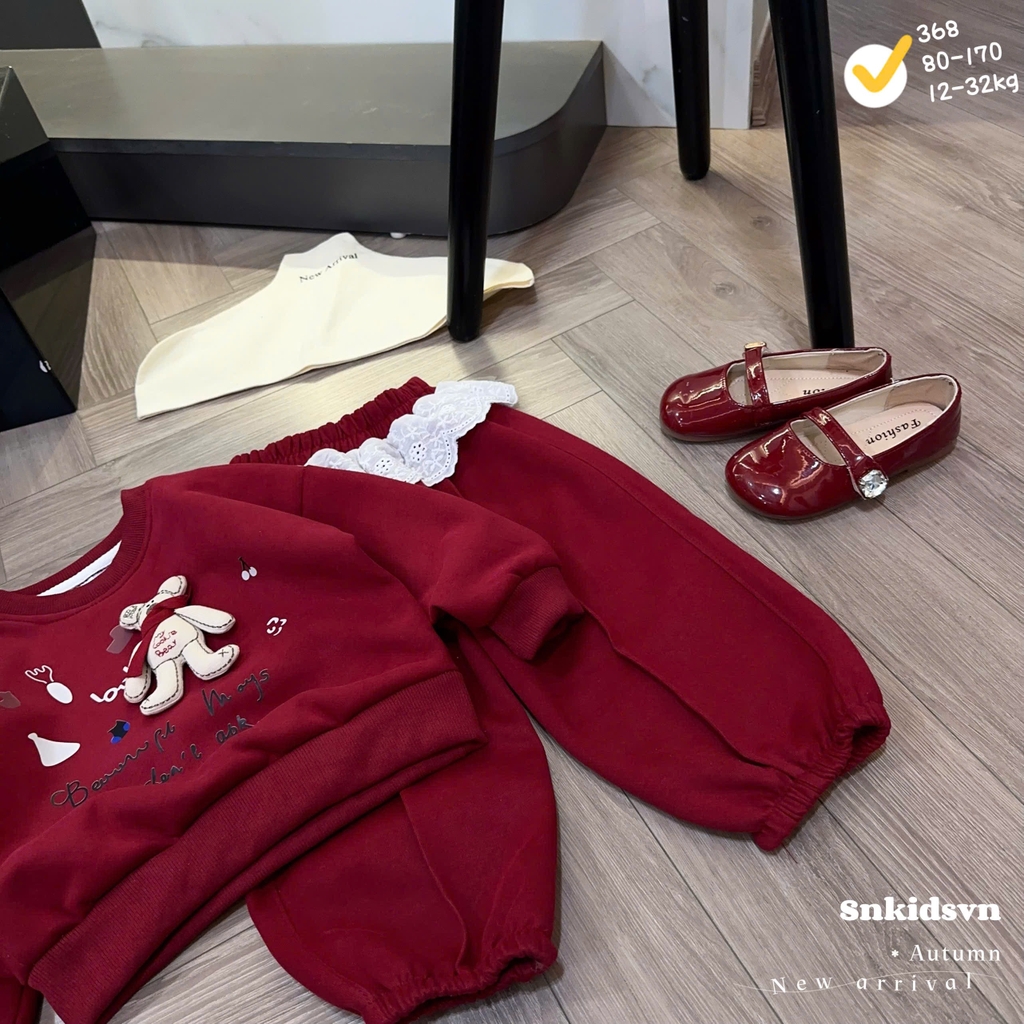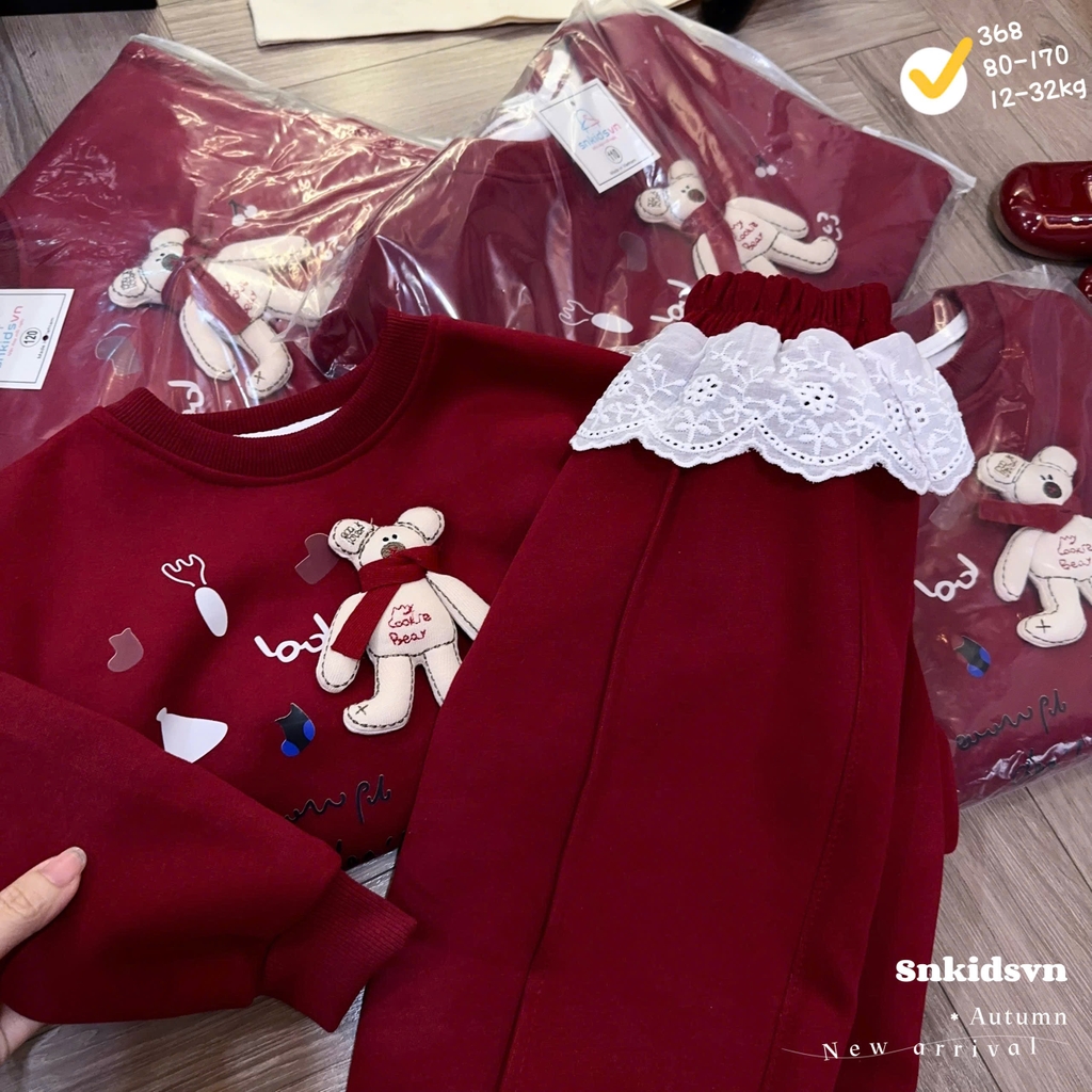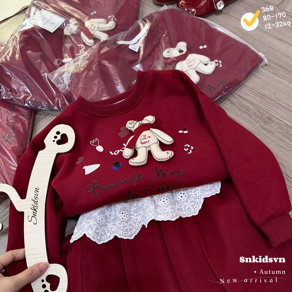 Bt758- Bộ nỉ đỏ viền ren trắng đính gấu nổi chất nỉ hai da cao cấp