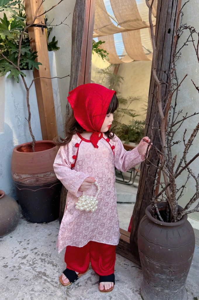 Bt767- Bộ áo dài bé gái màu hồng quần đỏ kèm khăn