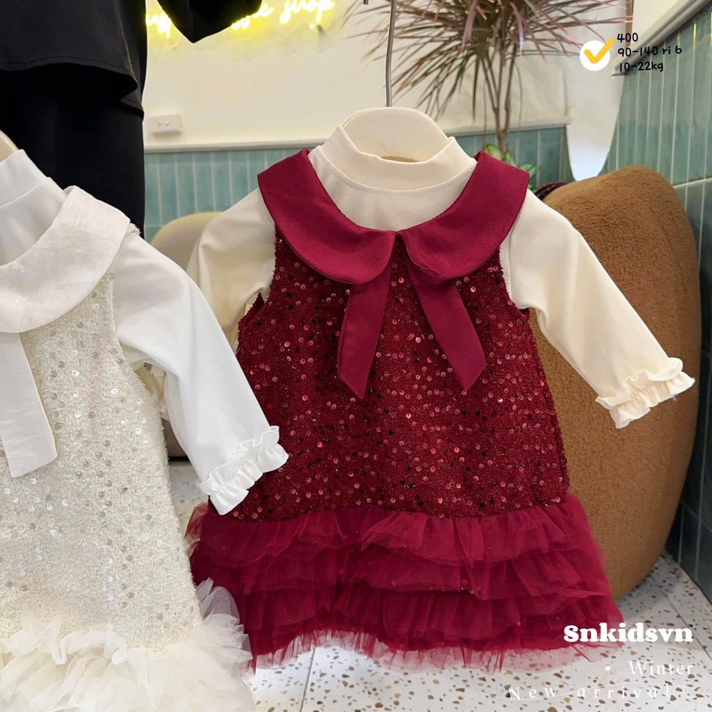 Bt791- set đầm Nơ dạ bé gái bè màu đỏ 2 lớp CV có lót