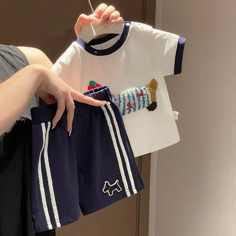 BT834- Bộ cotton đính chó nổi viền trắng-xanh trẻ em
