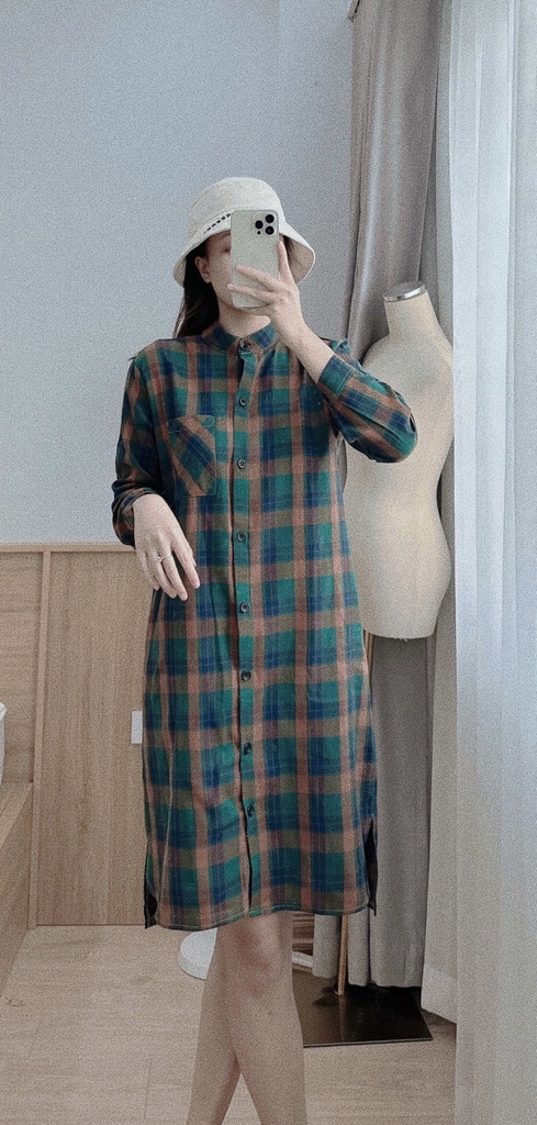 Đầm kẻ suông 3 màu cổ tàu