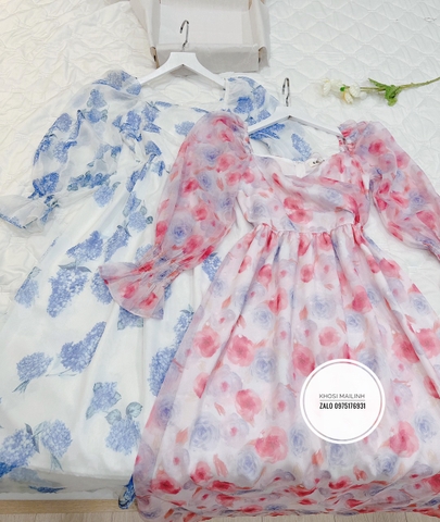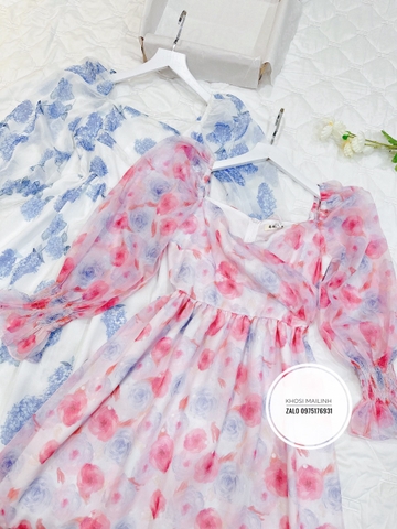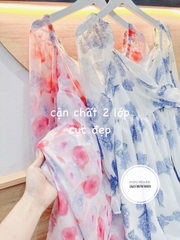Đầm voan hoa tơ 2 lớp chéo ngực 2 màu xanh, hồng