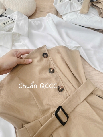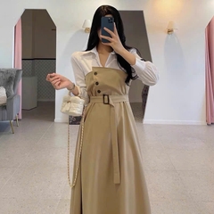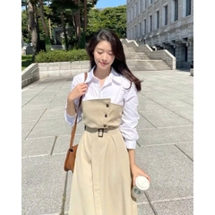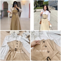 Dam126- Đầm kaki nâu phối sơ mi liền tặng kèm đai