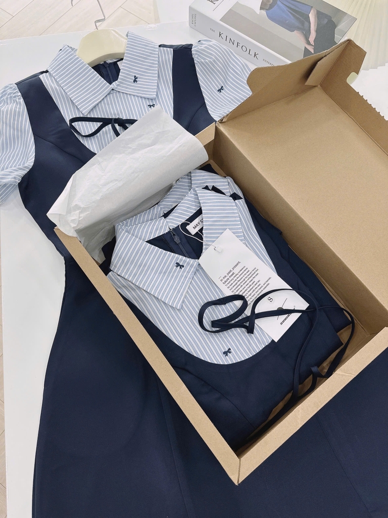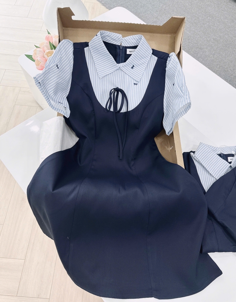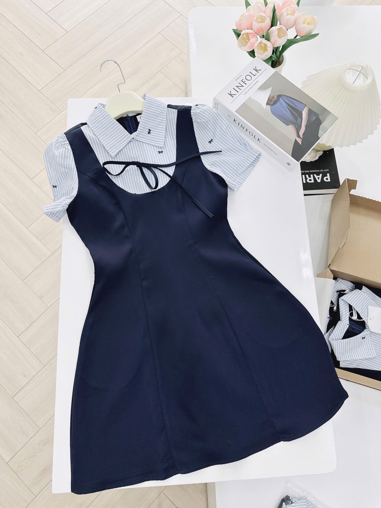 Đánh giá Dam174- Váy xoè ngắn đen phối tay sơ mi kẻ đính nơ