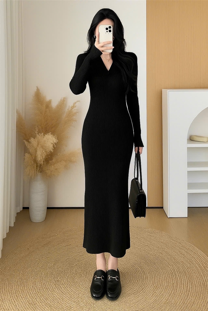 Đánh giá Dam186- đầm len tăm cổ đức 2 màu đen- be dáng dài 110cm