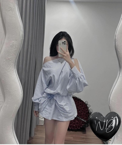 Đánh giá DAM188-ĐẦM KẺ XANH LỆCH VAI DÀI TAY ĐÍNH HOA EO CÓ QUẦN BẢO HỘ