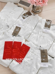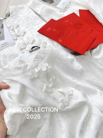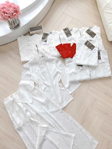 SET444-Set pháp phục trắng gấm lụa phối cúc tết