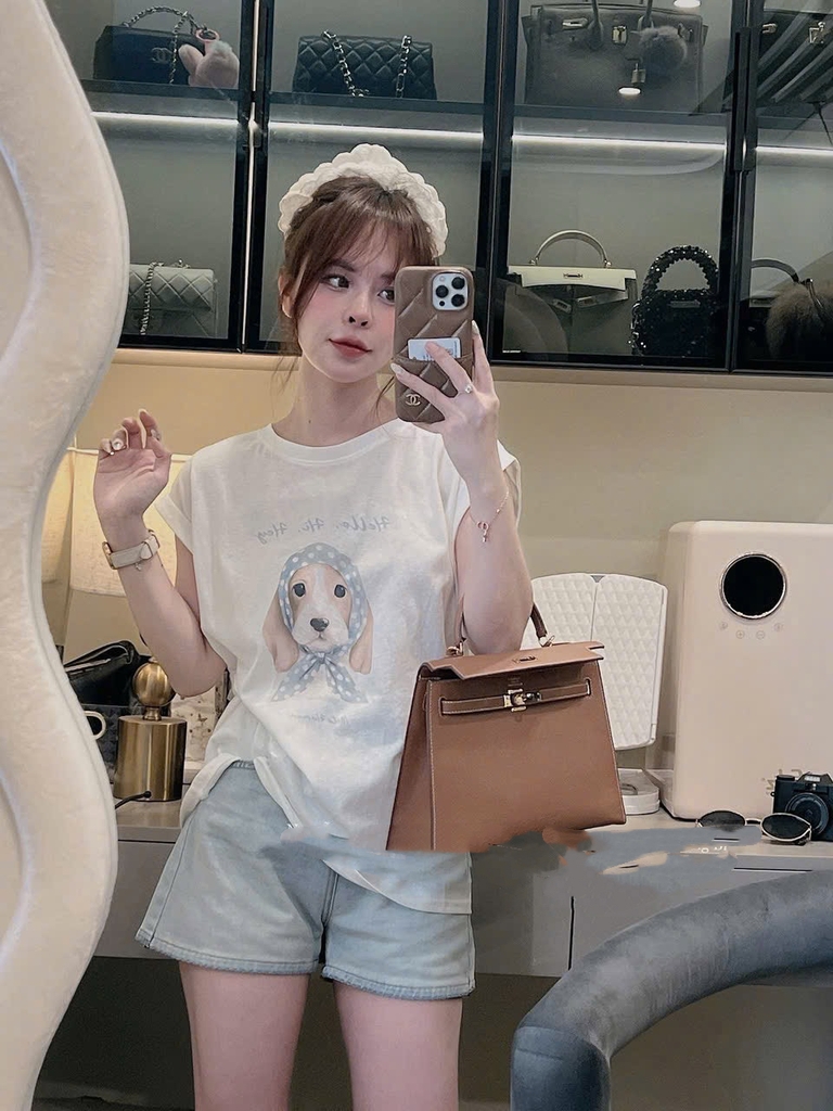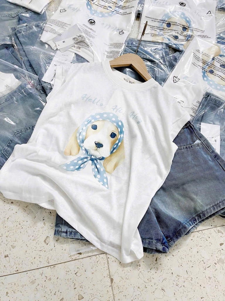 set615- Set áo cotton trắng In Cún mix quần short jeans