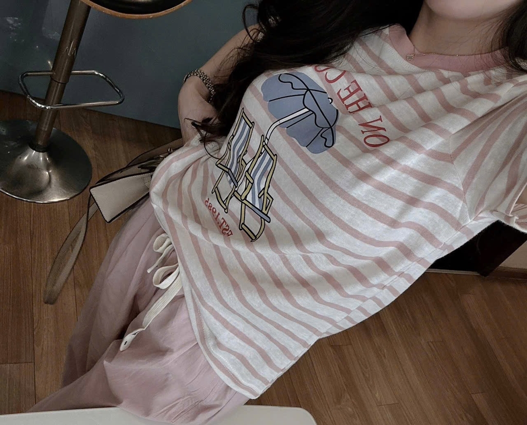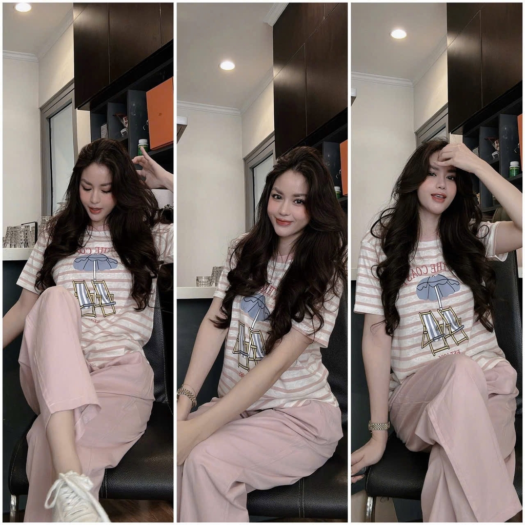 Set716- Set COAST hồng kẻ mix quần bom gió