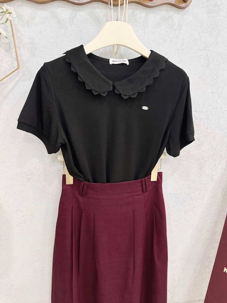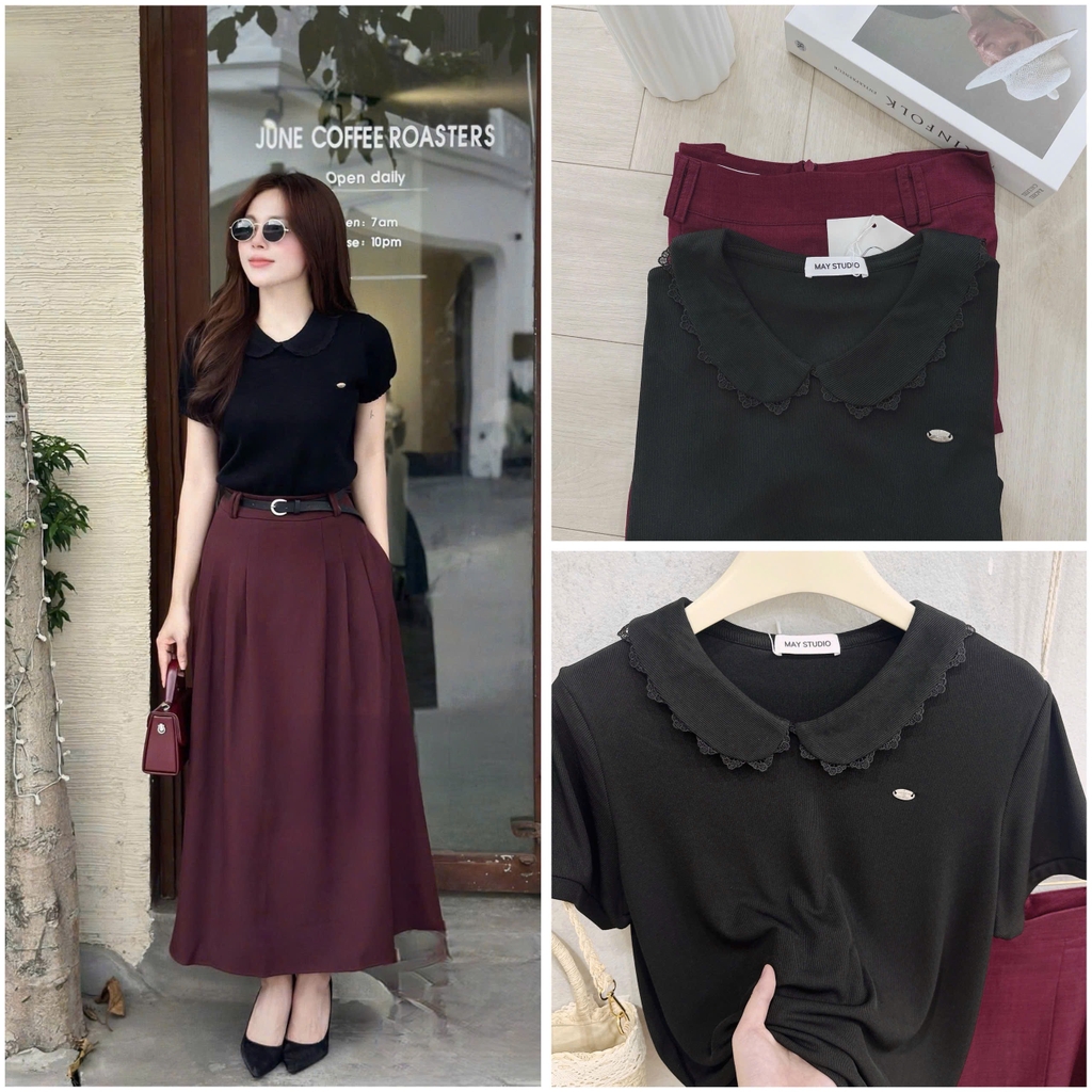 Set728- Set công sở áo tắm cổ ren phối chân váy midi dài