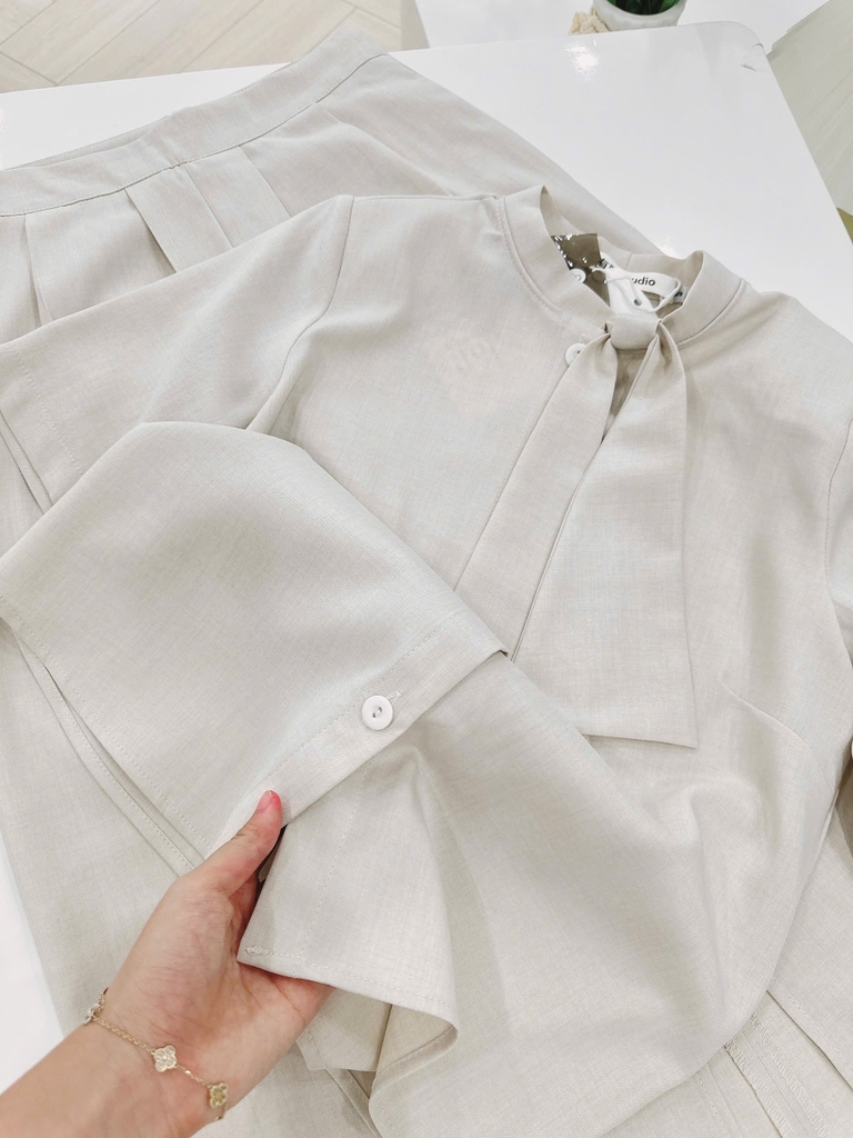 SET733- Set công sở áo cộc tay nơ cổ phối chân váy midi chữ A
