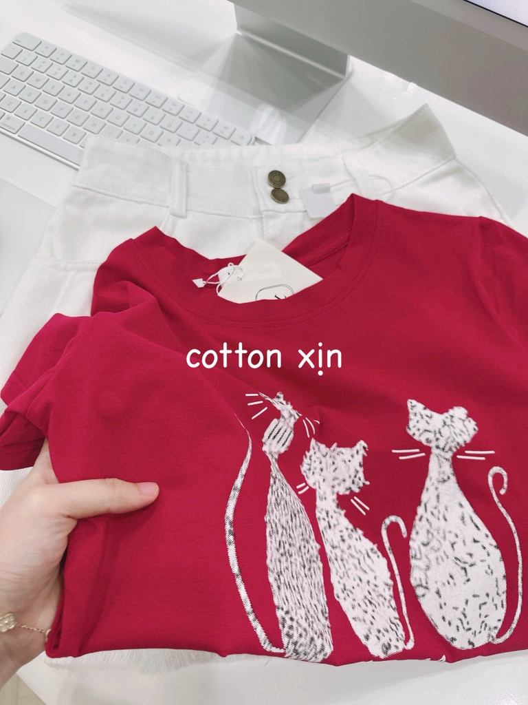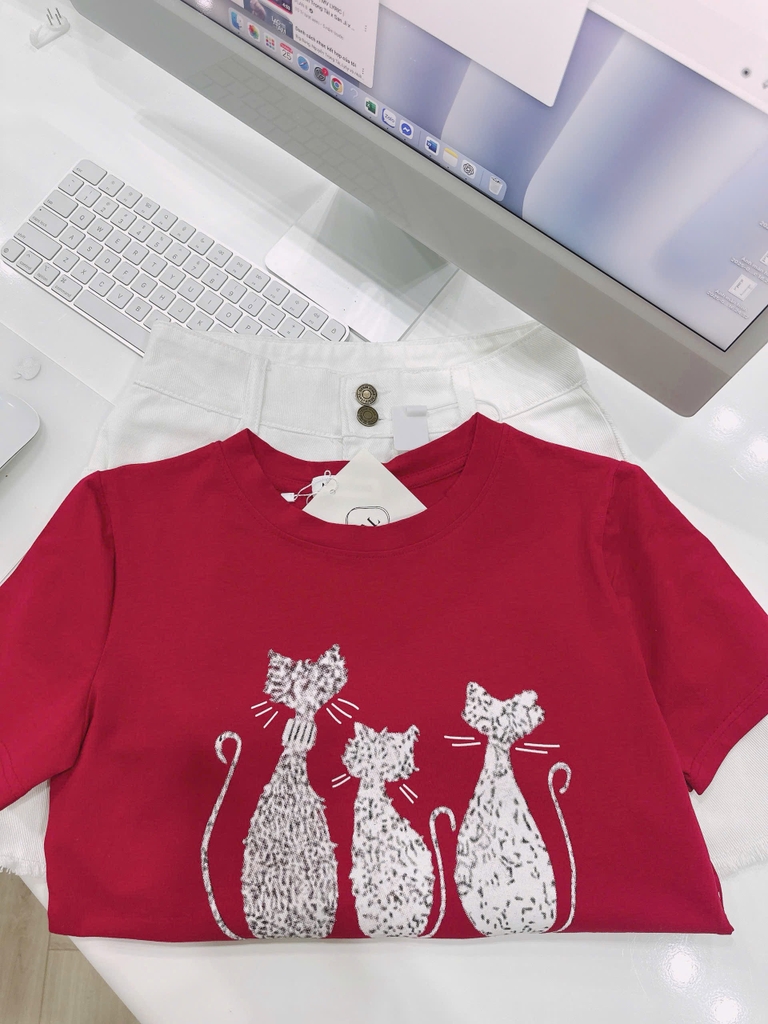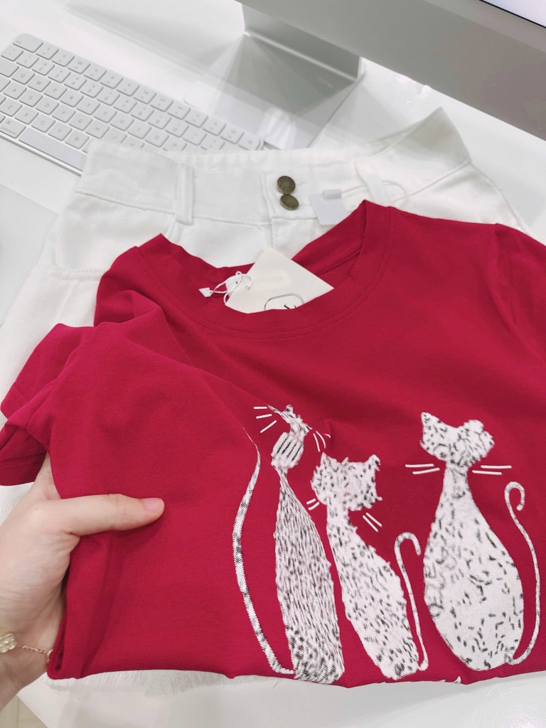 SET739-Bộ dạo phố áo thun Mèo đỏ phối chân váy jean trắng