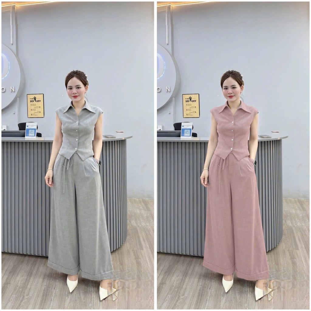 ☘️ set765- SET BỘ ÁO CỔ BẺ V MIX QUẦN LOE ỐNG RỘNG HAI LỚP 🌿