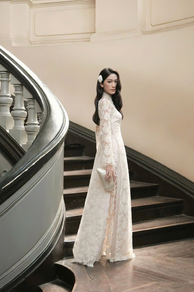 Set796-Set áo dài ren trắng 4 tà 2 lớp kèm quần lụa