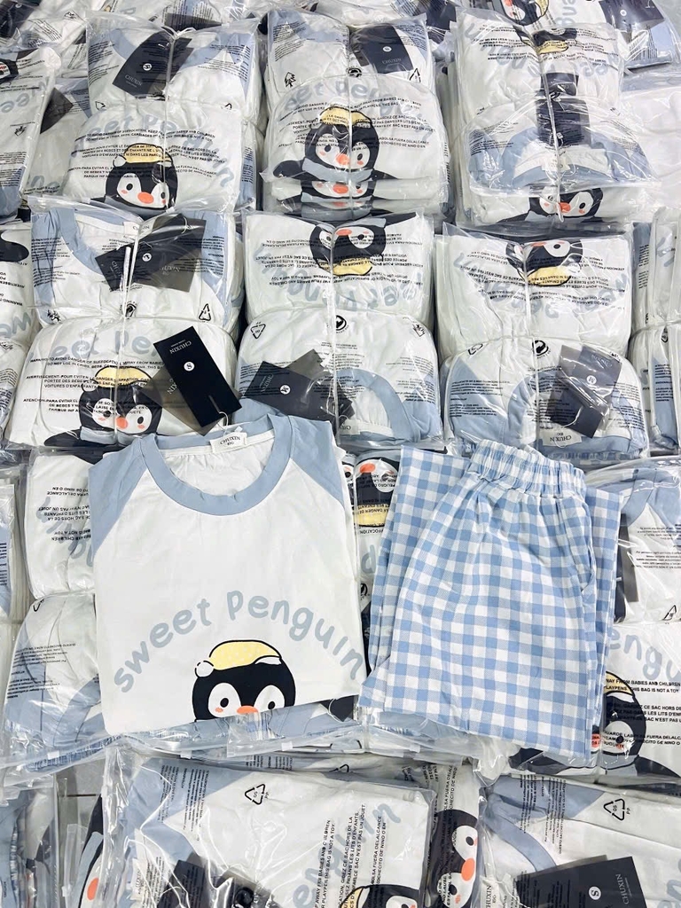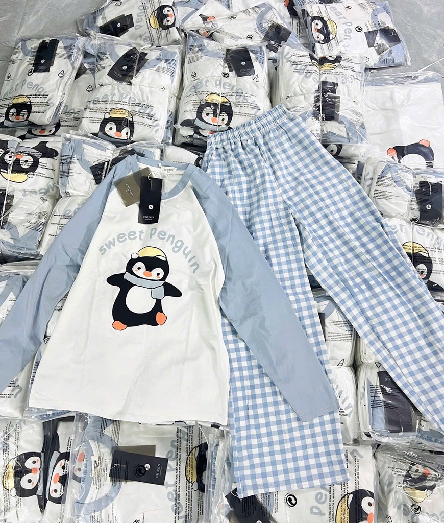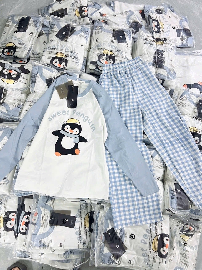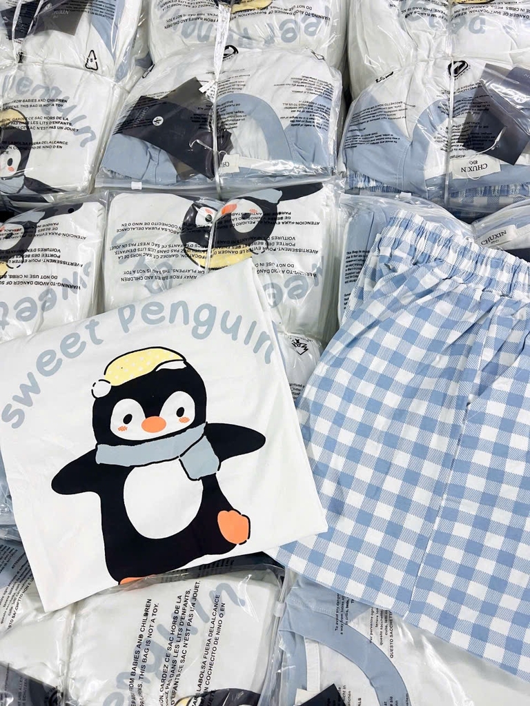 Set81- Set mặc nhà áo cotton chim cánh cụt phối quần suông kẻ