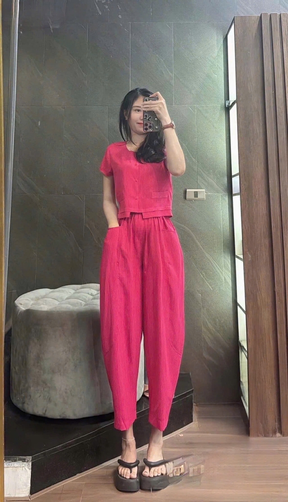 Set875-Set áo cộc kẻ hồng phối quần baggy dài