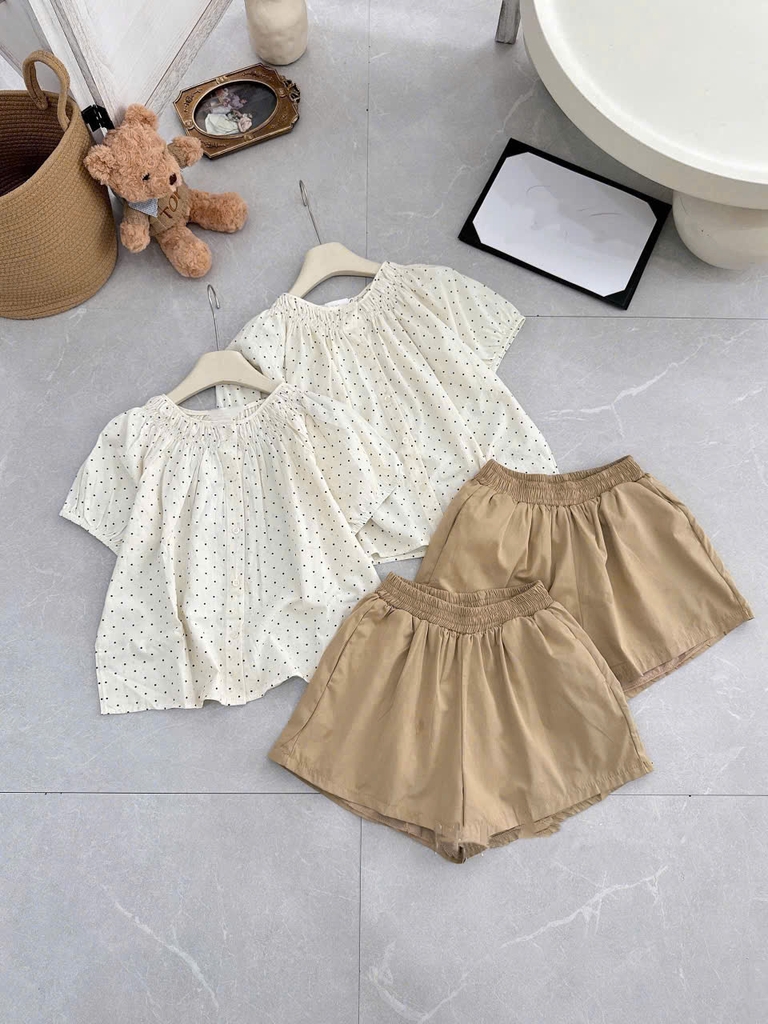 SET927-Set áo voan màu be chấm bi mix quần short kaki