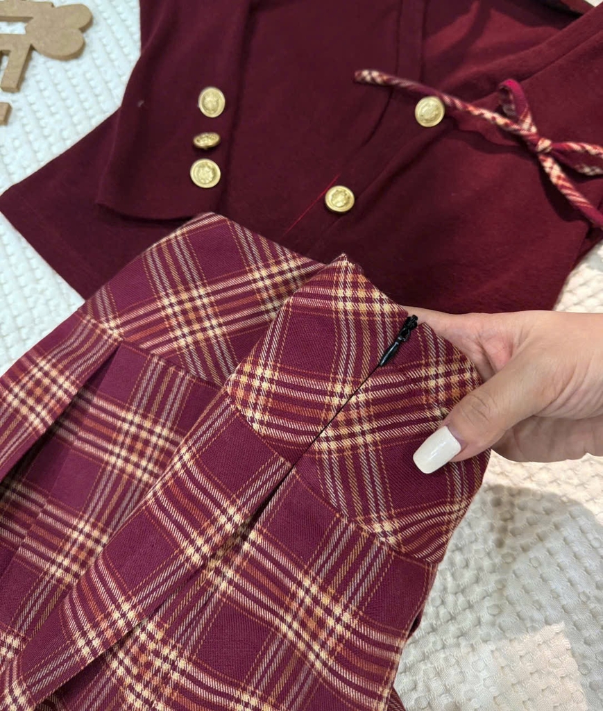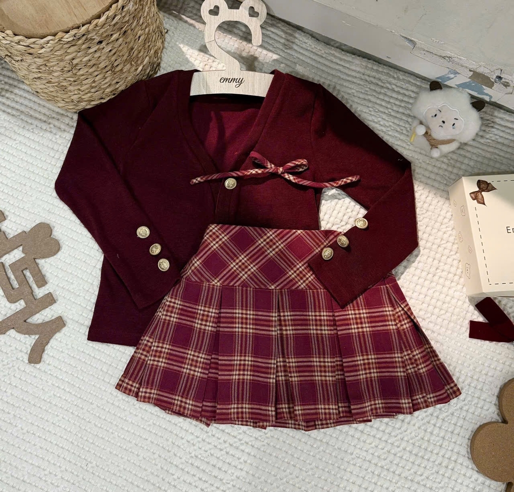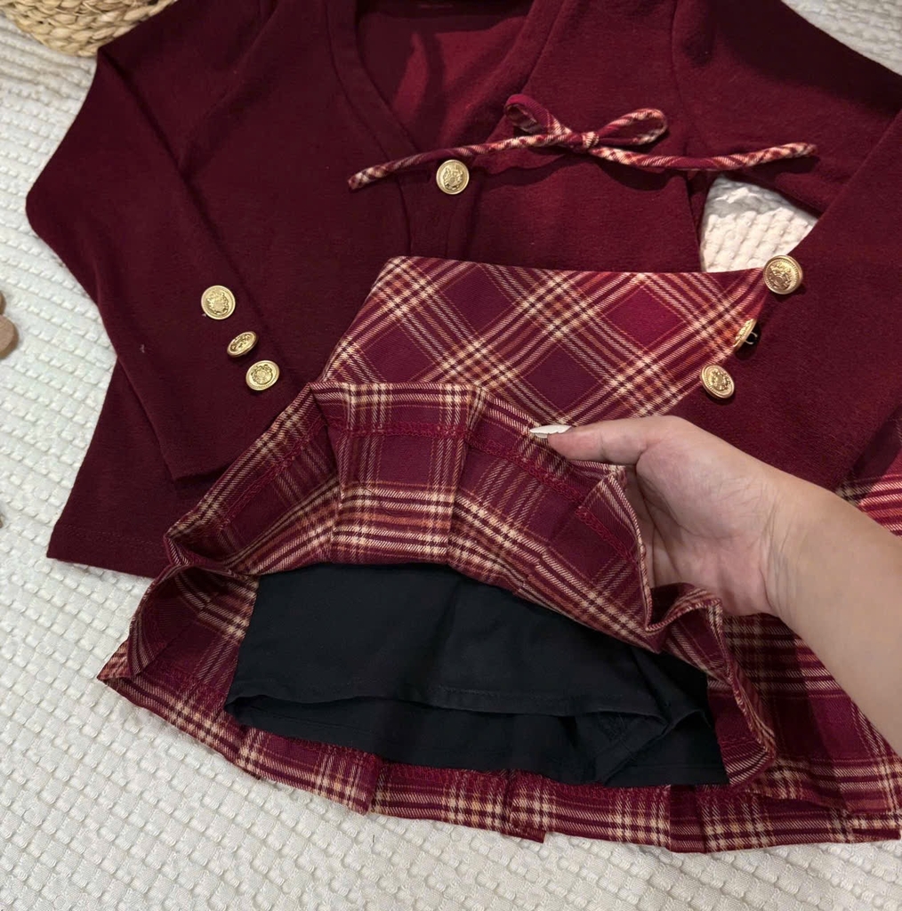Setkid01- Set váy bé gái màu đỏ cúc đồng thiết kế CV có lót