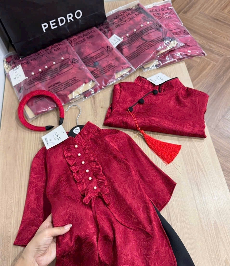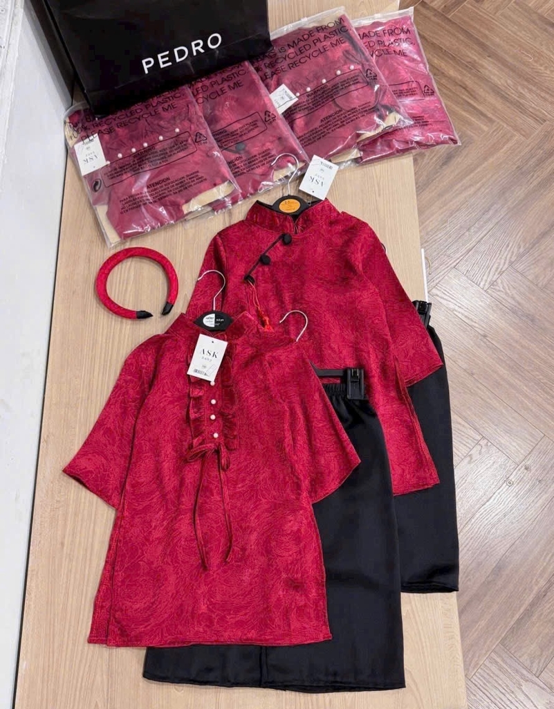 SETKID059- Set áo dài trai/gái đỏ quần lụa đen